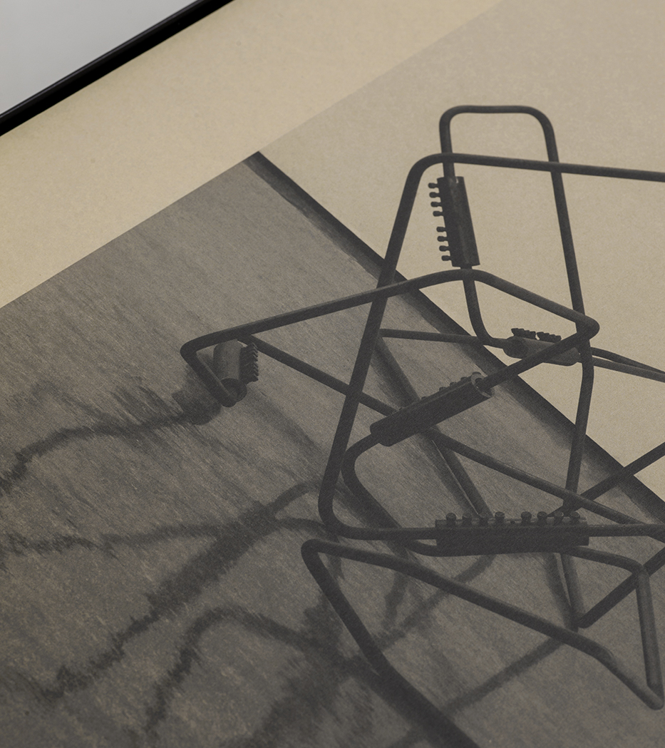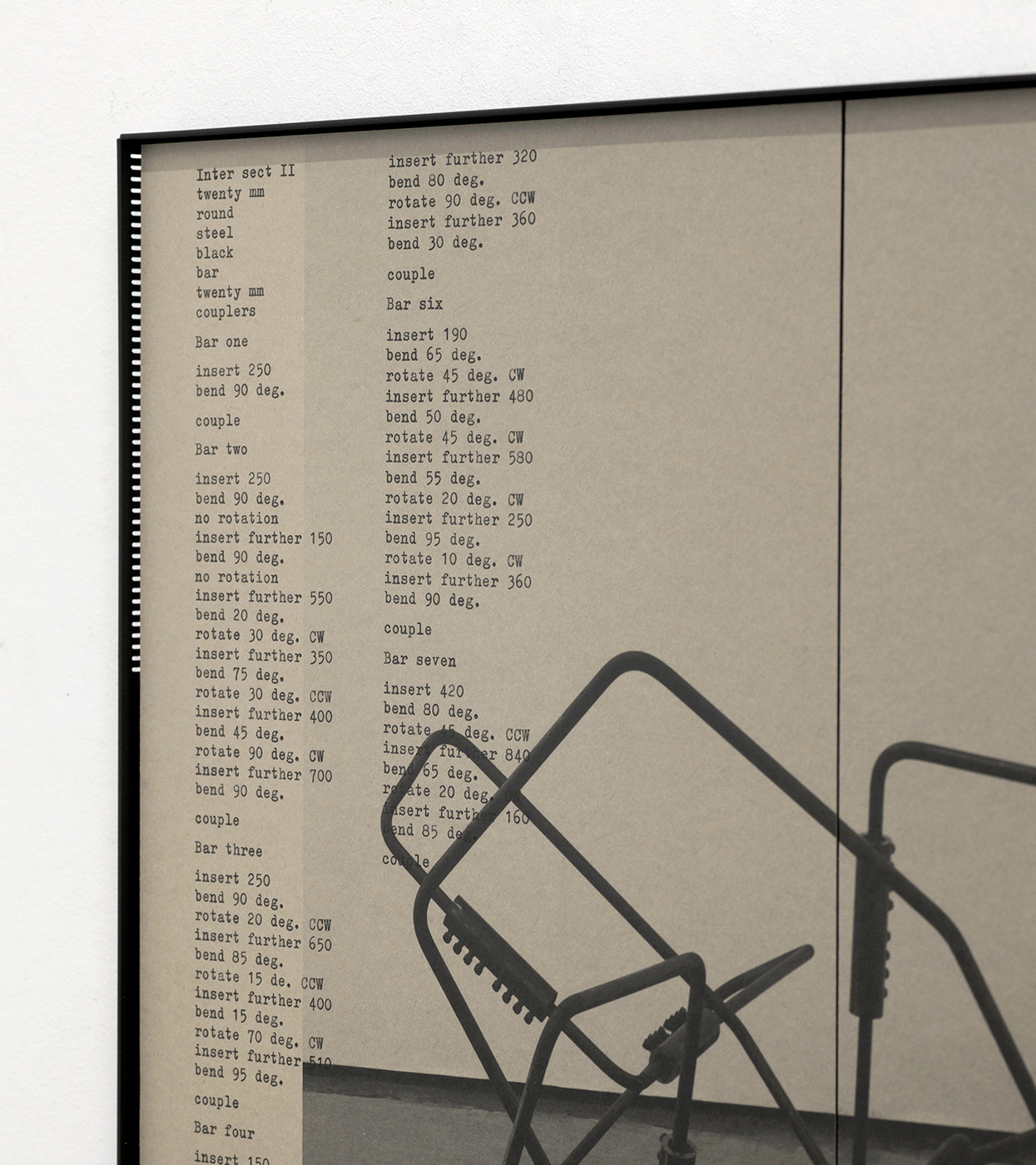 This is a late edition, originally intended to accompany a show from last year entitled Map of horizons, which featured an iteration of the sculpture series Insert | Bend | Rotate – This series of intersecting sculptures evolved from site based sculpture carried out in 2016 using generic subsurface structural materials and was realised in four variants before being stripped for parts and it's sections recycled. These prints are the remains of the series. The coupling devices and connecting rods are now being re-imagined and worked to construct a new site based work which will be made throughout 2022. There are three variants of this edition, print only (contained within Map of horizons print set), mounted and cased and a special edition which was cut, over typewritten with the original build instructions, mounted and cased (specification above)