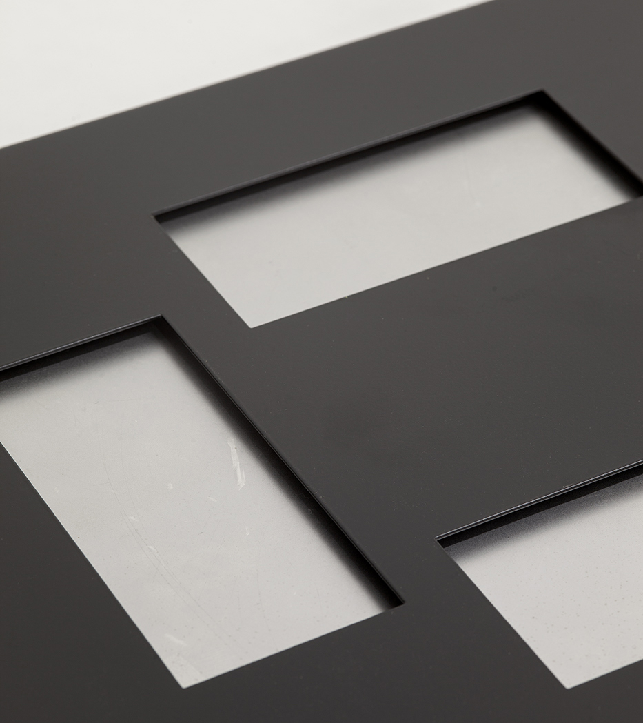 Single colour offset print mounted on electrolytically coated steel, bonded in laser cut, pressed and powder coated 18 – gauge steel chassis 385 x 315 x 10mm. Special edition is a split typewritten single colour offset print mounted on two panels of electrolytically coated steel, bonded in laser cut, pressed and powder coated steel chassis 385 x 315 x 10mm